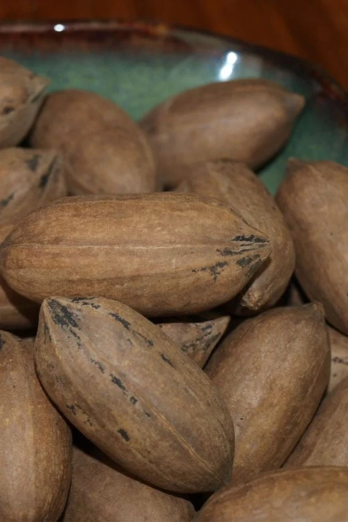 Aside from producing some of the most delicious nuts on earth, pecan trees make very nice shade trees in the edible landscape. Ornamental features include the attractive pinnately compound deep green leaves that turn golden-yellow in fall, and slate-grey color bark that has a lightly fissured texture.