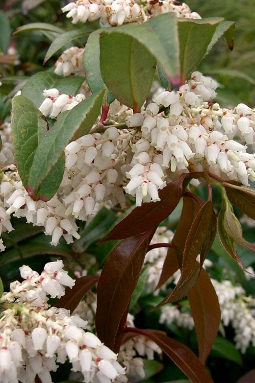 A wonderful selection of our native Leucothoe axillaris, ‘Squzam’, what we call Red Tip Coastal Leucothoe, forms a spreading mound to 3 to 4 feet tall and maybe a little wider with arching stems clothed in lush, thick, dark green elongated leaves that turn to a vivid-burgundy-red in winter, which really puts on a show when there’s snow on the ground. In April to May, abundant clusters of fragrant, bell-shaped white flowers are borne in the axils of the leaves, hence “axillaris” in the scientific name. An excellent evergreen companion to other shade to part shade loving plants such as Aucuba, Mahonia, Rhododendron and Illiciums (Anise), along with shade loving perennial ferns, Hosta and Heuchera.