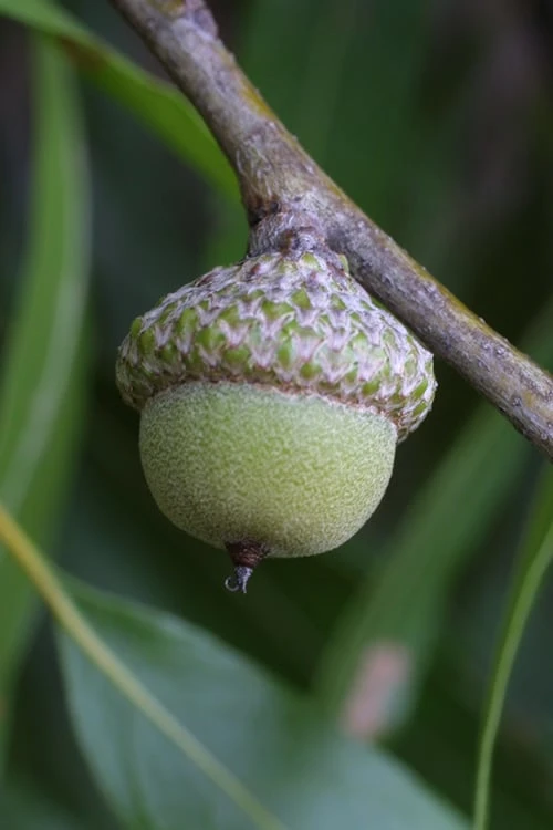 A strong but beautiful large and fast growing tree, the Willow Oak shares similarities with other oaks but is unique in many other ways. Its most distinct attribute is the shape of its willow-like leaves; averaging 5 inches long and very narrow compared to the leaves of other oaks, hence the common name. The leaves emerge a bright green in spring shifting to a deeper green during summer. Fall brings shades of yellow, bronze and orange. It yields round, 1/2″ acorns that birds, deer and small animals will enjoy. The young bark is smooth and reddish-brown aging to gray-brown with shallow ridges and furrows. The strength of the willow oak can be seen by its majestic size and its rapid rate of growth up to 50 to 70 feet tall and 30 to 50 feet wide with a pyramidal shape when young maturing to an oval to rounded shape. A great and long-lived shade or street tree!
